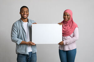 Black muslim couple holding big white empty board while standing against gray background in studio