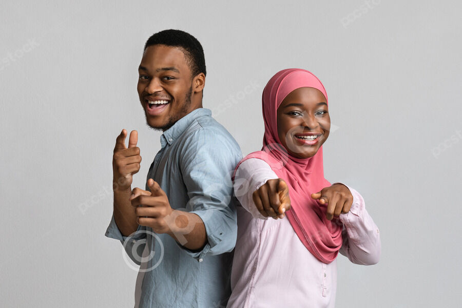 Black muslim couple pointing fingers forward standing back-to-back against gray background in studio