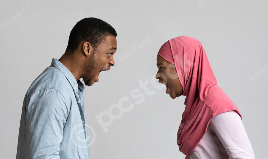 Black muslim couple pointing fingers to each others while standing against gray background in studio