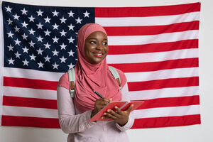 Black Muslim woman in hijab holding notepads standing with backpack in front of USA flag