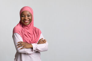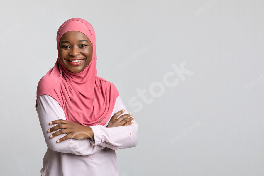 Black muslim woman in hijab standing with crossed arms against gray background in studio