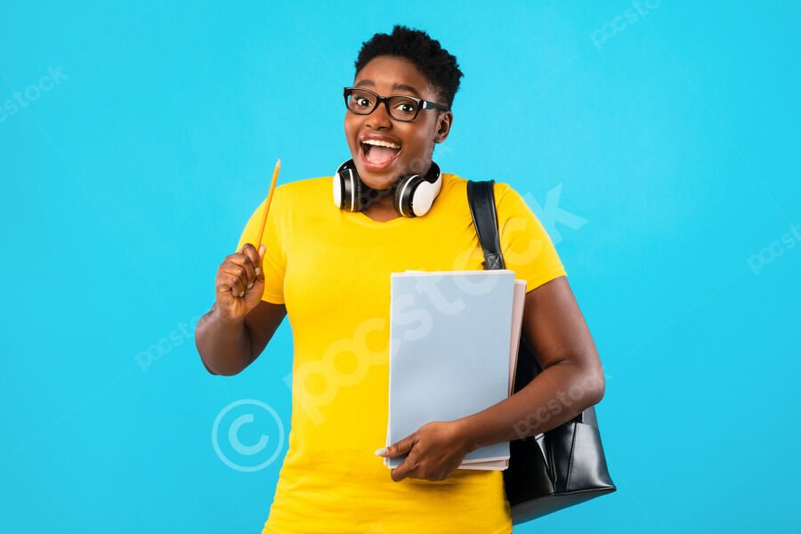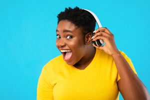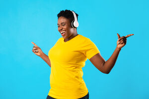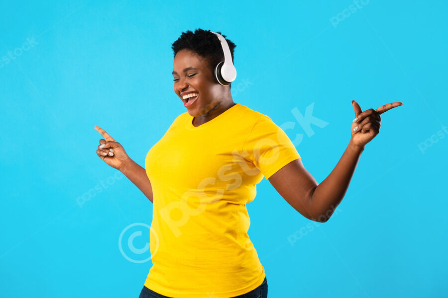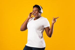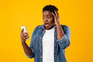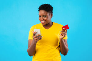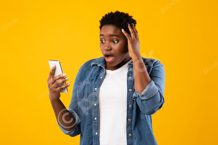Smiling Black woman holding smartphone and looking sideways standing against purple wall in studio