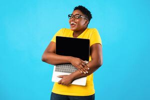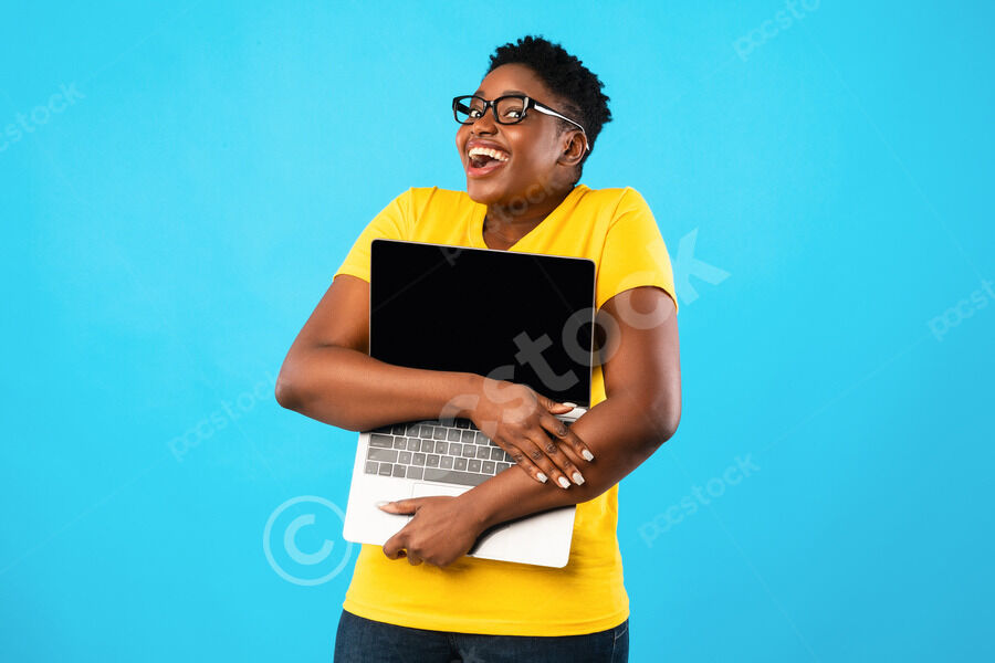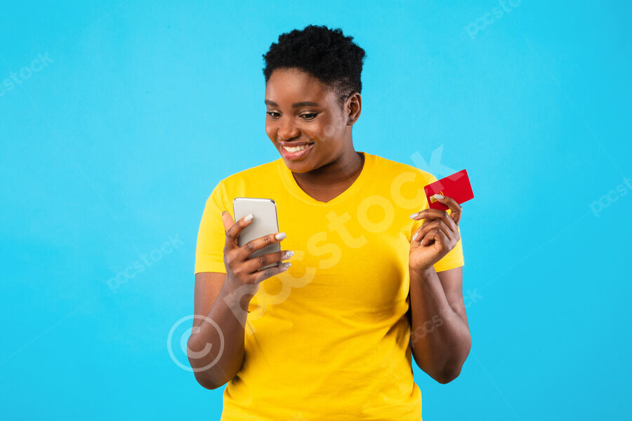 Smiling Black couple holding credit card and laptop standing together against purple wall in studio