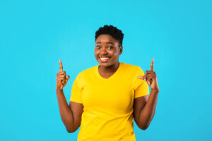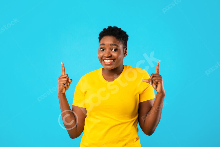 Shocked Black couple pointing their fingers up while standing together against purple wall in studio