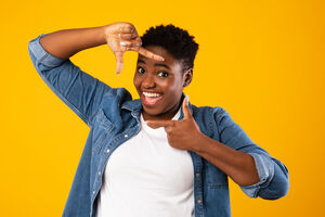 Smiling Black woman leaning on her boyfriend's shoulder and taking selfies on smartphone while standing in front of purple wall in studio