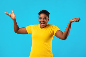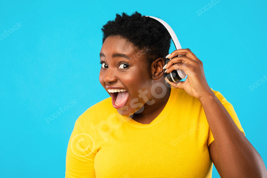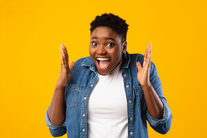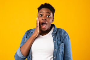 Black woman with mouth wide-open listening to her boyfriend whispering on her ear while standing together in front of purple wall in studio