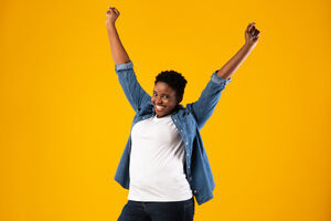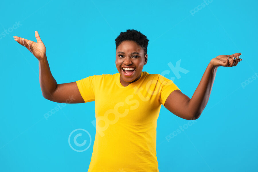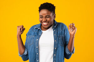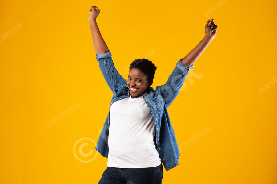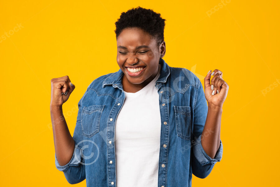 Cheerful Black couple celebrating with clench fists while standing together in front of purple wall in studio