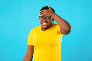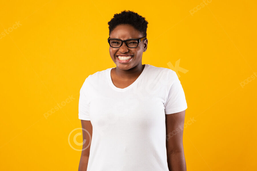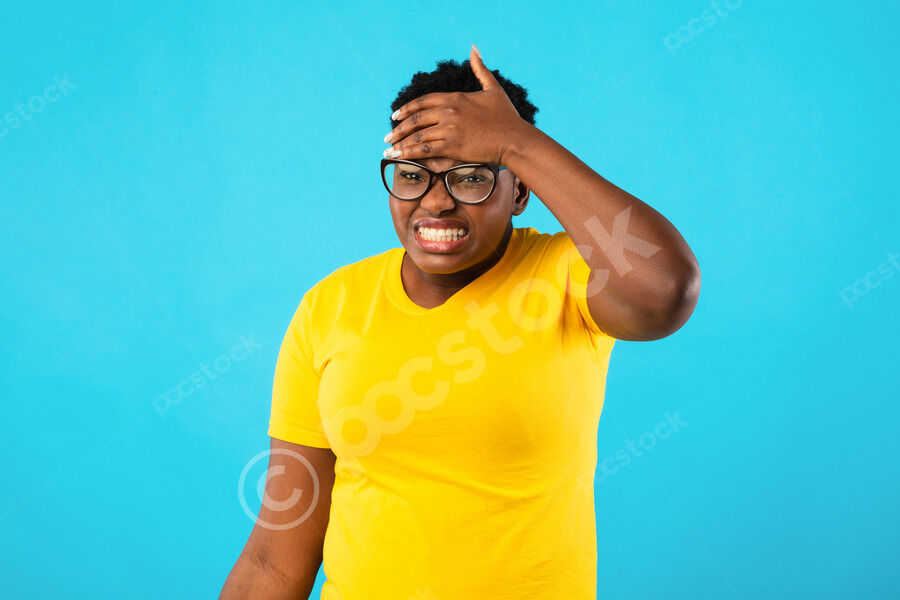 Black woman shrugging her shoulders with boyfriend scratching his head while standing together against purple wall in studio