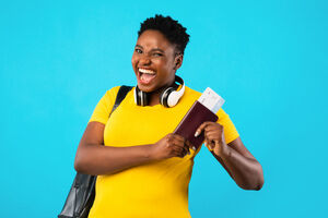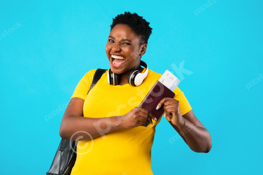 Smiling Black couple celebrating and standing together against purple wall in studio