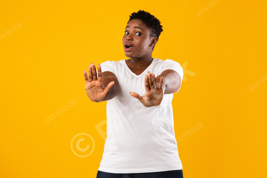 Black man looking scared showing stop sign with his girlfriend covering face with her hands while standing together against purple wall in studio