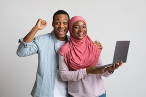 Black man raising his fist standing with hand on shoulder of muslim wife wearing hijab using laptop against gray background in studio