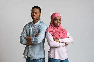 Black muslim couple feeling frustrated after quarrel standing with crossed arms against gray background in studio