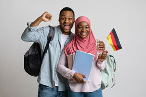 Black muslim woman in hijab holding notepads and German flag standing with male classmate against gray background in studio