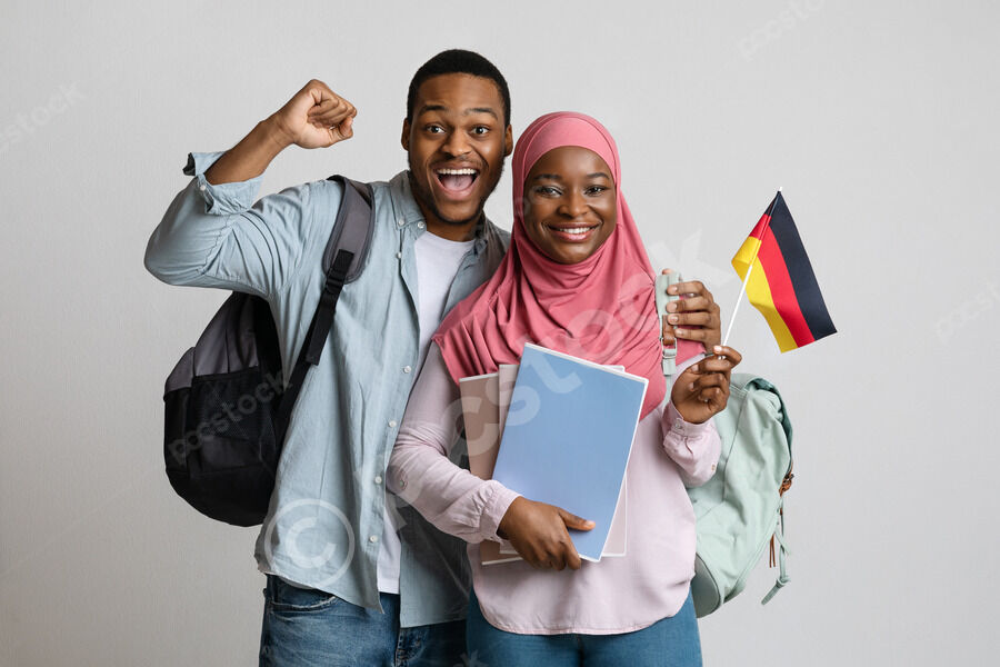 Black muslim woman in hijab holding notepads and German flag standing close with male classmate against gray background in studio