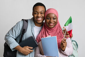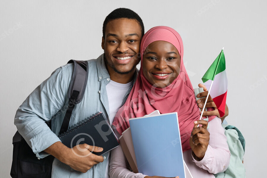 Black muslim woman in hijab holding notepads and Italian flag standing close with male classmate against gray background in studio
