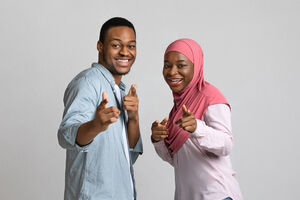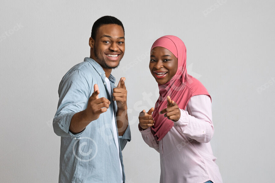 Black muslim couple pointing fingers forward while standing against gray background in studio