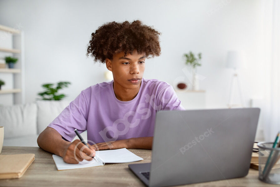 Black man doing thumbs up watching on laptop standing in kitchen at home
