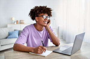 Black man with arms behind head looking away sitting in front of laptop in kitchen at home