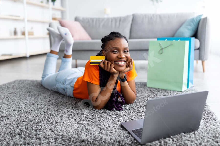 Cheerful Black female teenager with short hair holding and showing credit card sitting with laptop on sofa at home