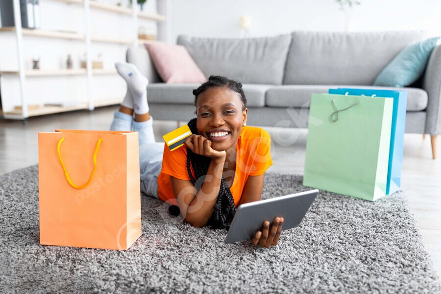 Cheerful Black female teenager holding credit card and using tablet while sitting on sofa in living room at home