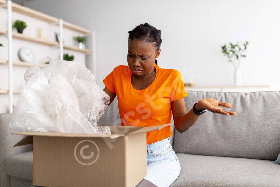 Stressed Black female teenager with hand on head looking at laptop while sitting with crossed arm on sofa in living room at home