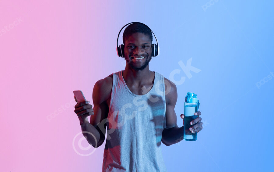Cheerful mixed-race female teenager listening to music on headphones holding smartphone dancing with head tilted sideways in living room at home