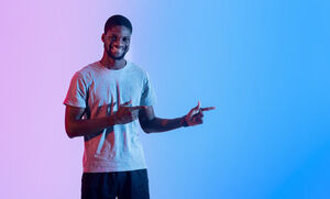 Mixed-race female teenager with party hat holding gift boxes with both hands standing in front of white wall in living room at home