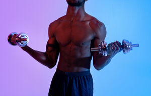 Black male teenager with hands behind head and closed eyes wearing earbuds listening to music lying on sofa at home