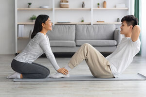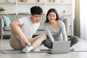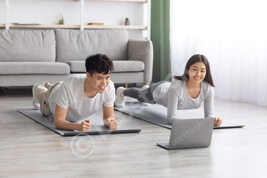 Asian woman wearing sportswear watching video tutorial on laptop doing plank exercise on yoga mat in living room at home