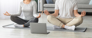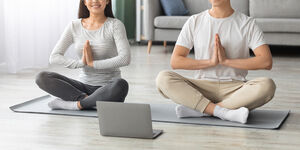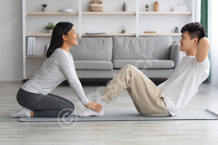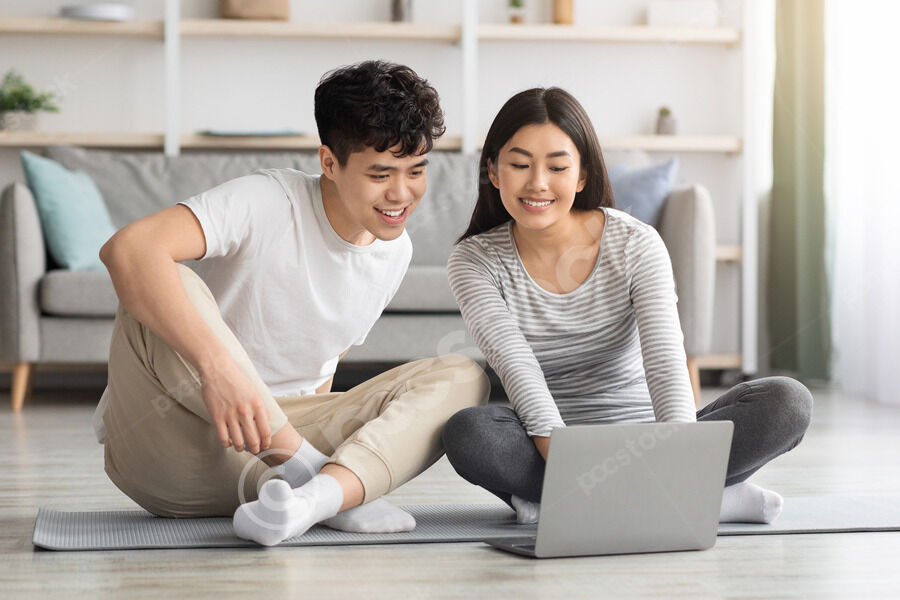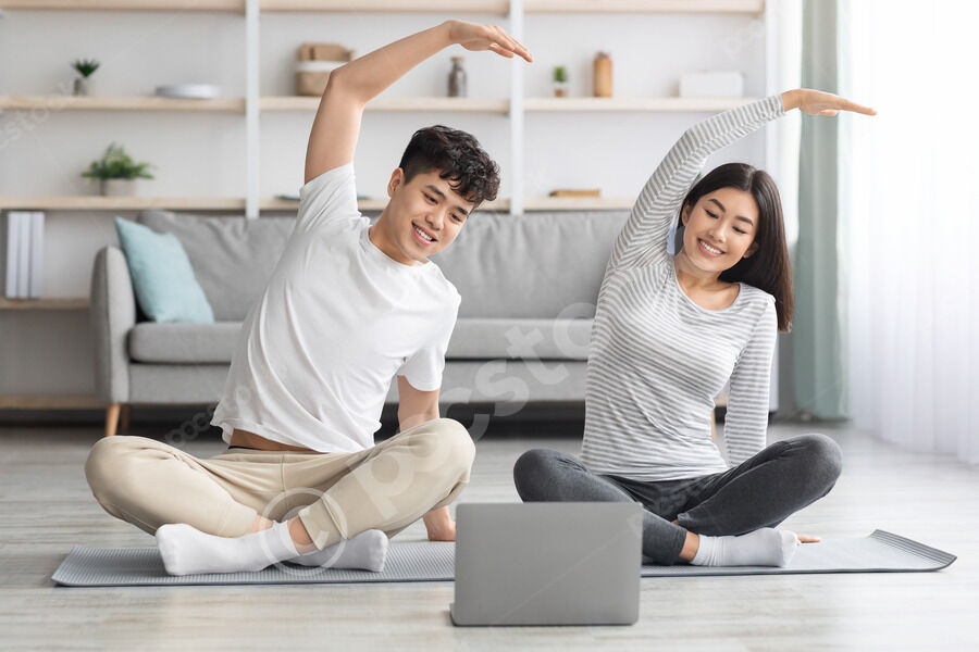 Asian woman wearing sportswear watching video tutorial on laptop doing leg lift exercise on yoga mat in living room at home
