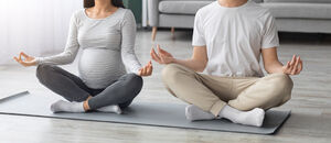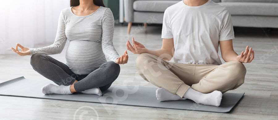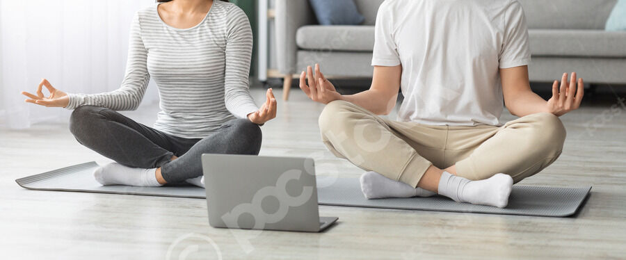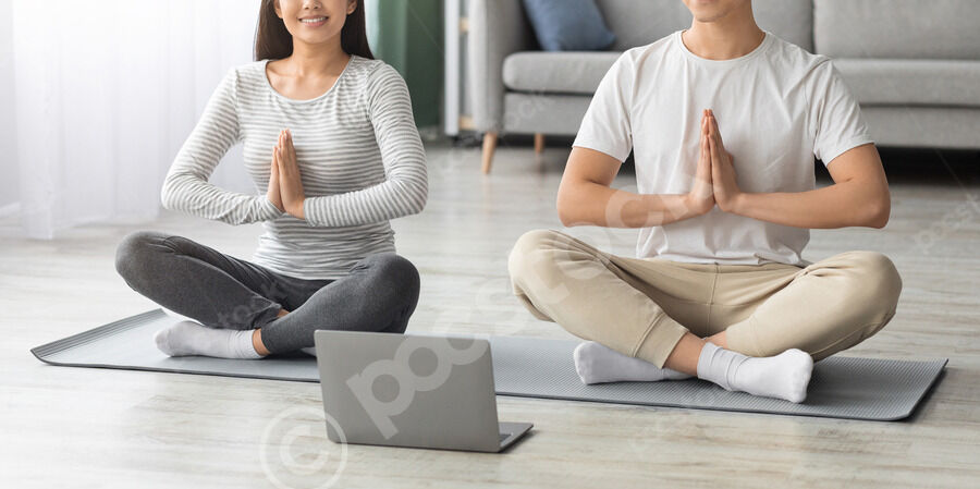 Asian woman with closed eyes and hands together wearing sportswear meditating in lotus position on yoga mat in living room at home