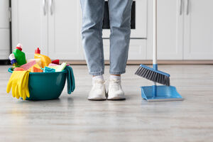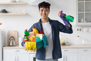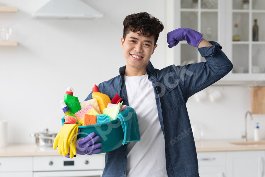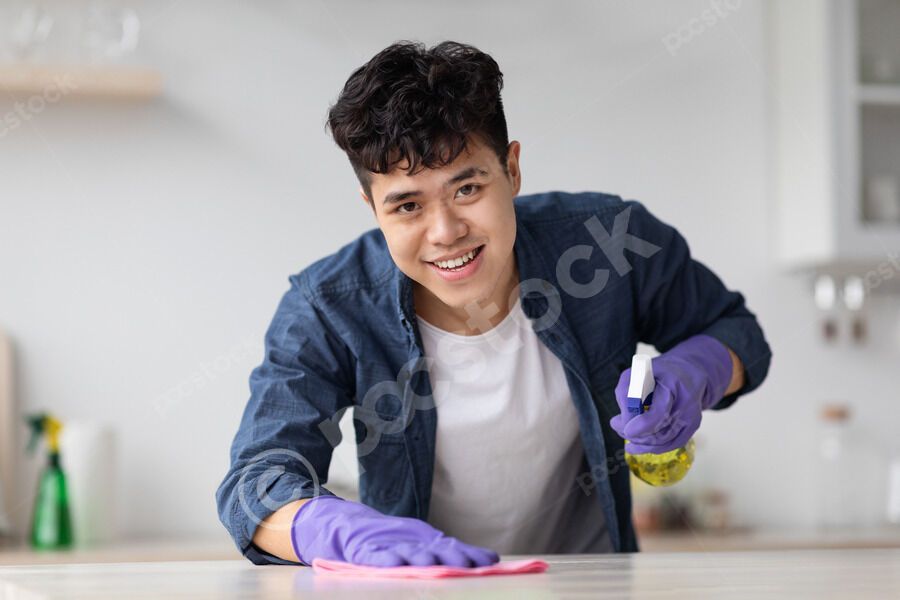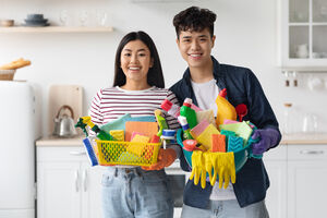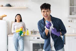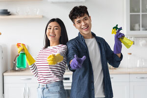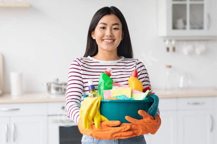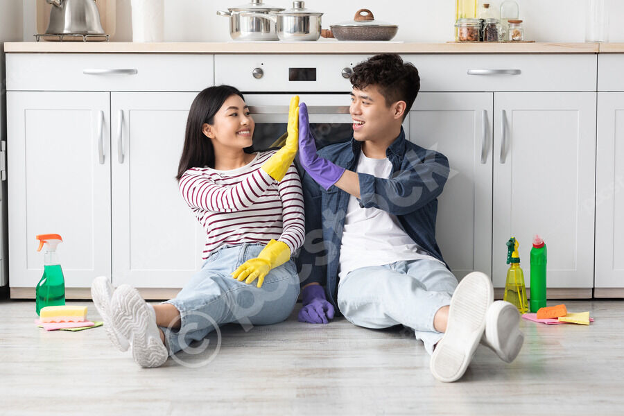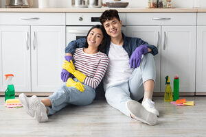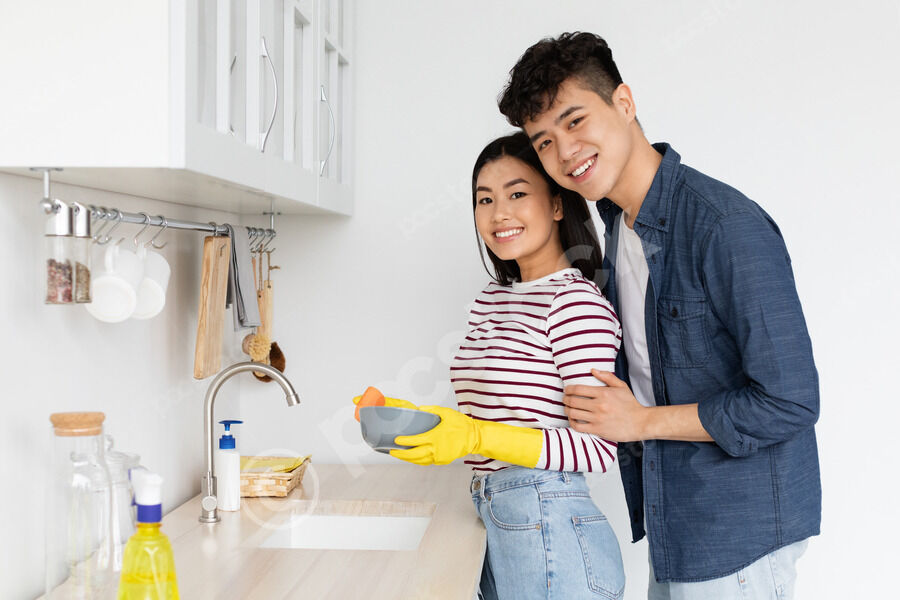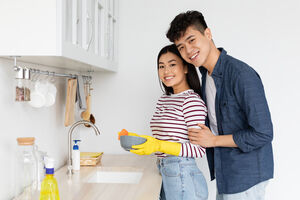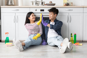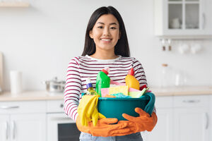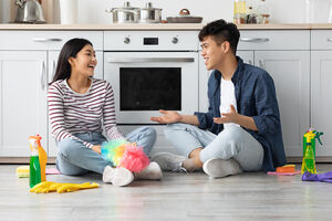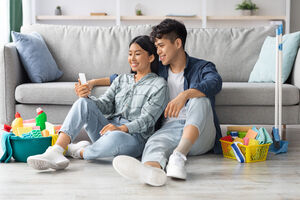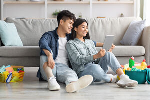Cheerful Asian woman with chin leaning on hand using tablet while sitting at home