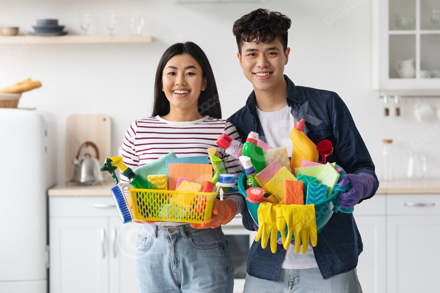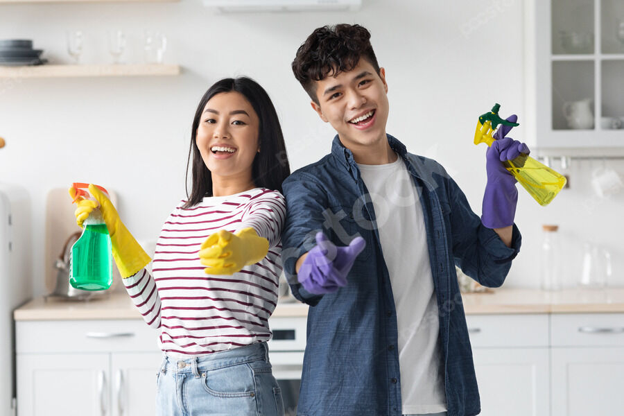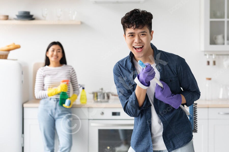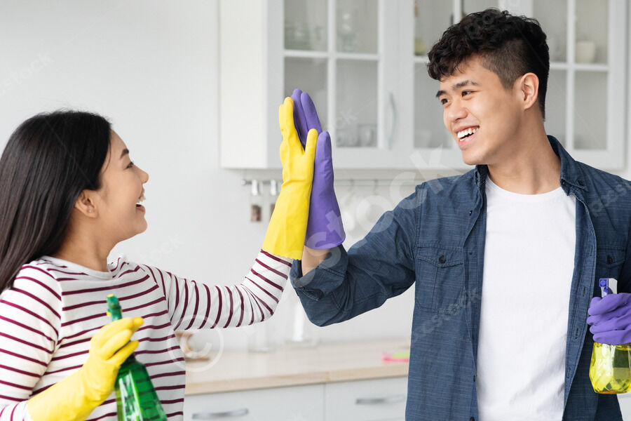 Cheerful Asian woman using tablet while sitting on sofa in living room at home