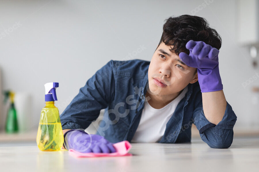 Crying Asian woman with head leaning on hand wiping tears with tissue looking down while sitting on sofa at home