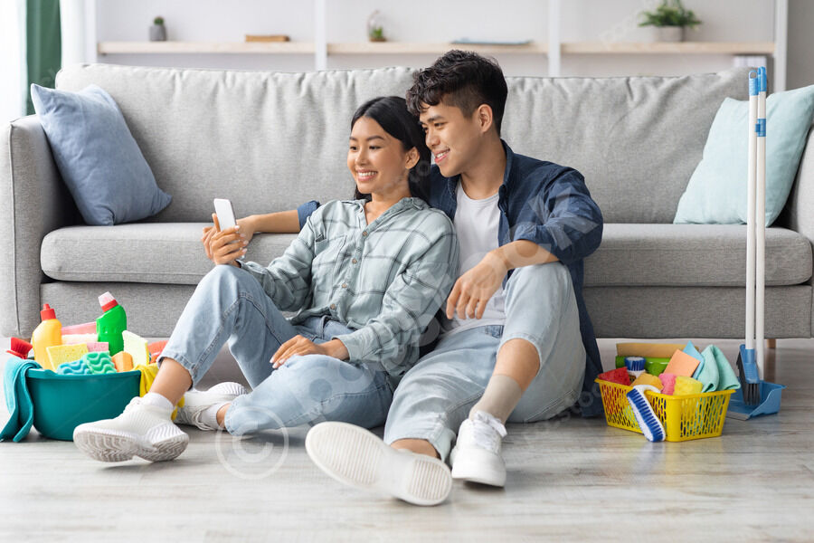 Cheerful Asian woman using smartphone while sitting on sofa in living room at home