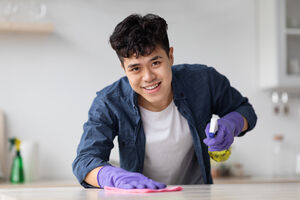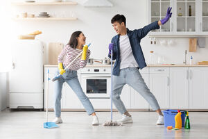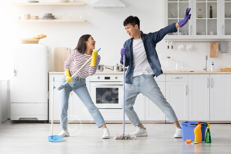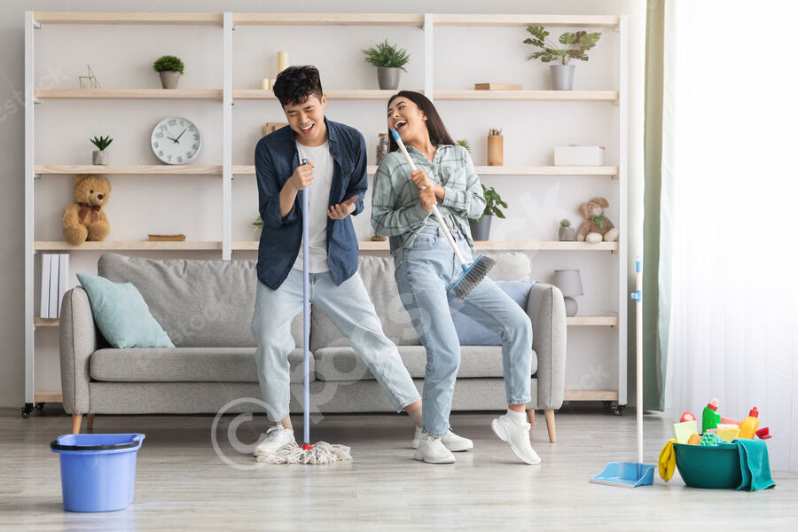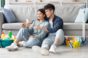 Asian woman wearing headphones listening to music using smartphone while sitting at home