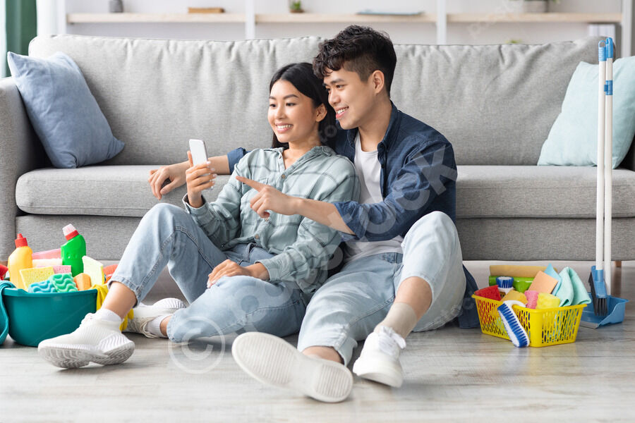 Cheerful Asian female vlogger filming herself on smartphone waving hand while sitting with crossed legs on floor carpet in living room at home