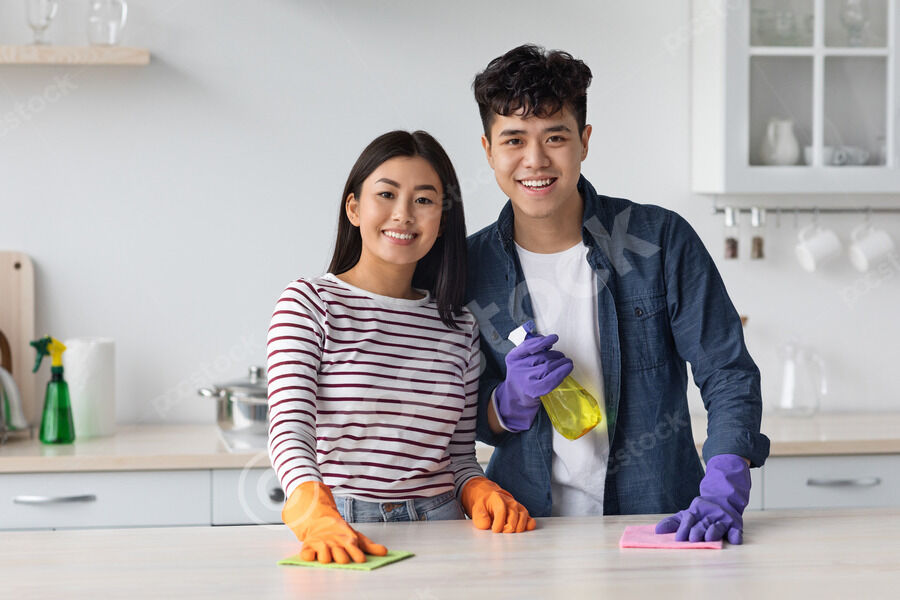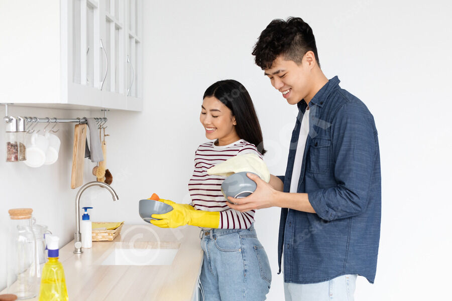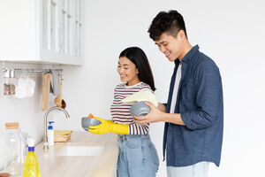 Asian woman wearing headphones using tablet while sitting on sofa in living room at home