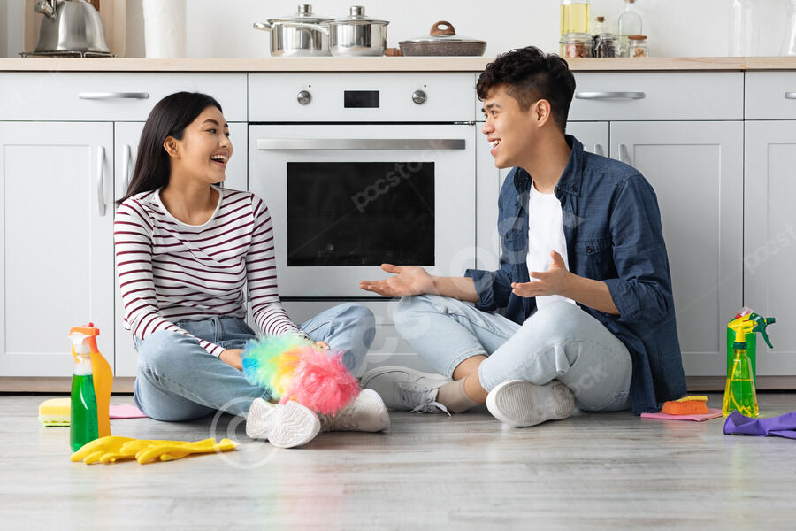 Cheerful Asian woman looking away and having phone call while sitting on sofa in living room at home