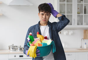 Asian woman with closed eyes covering ears with hands suffering from pain sitting on sofa at home