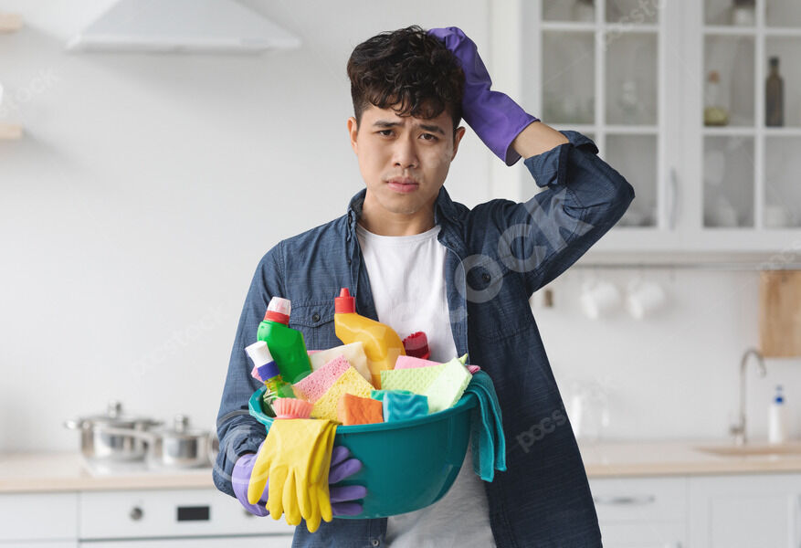 Sad Asian woman looking down leaning chin on hands while sitting on sofa at home