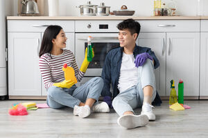Cheerful Asian woman wearing headphones listening to music and using tablet while lying on floor carpet in living room at home