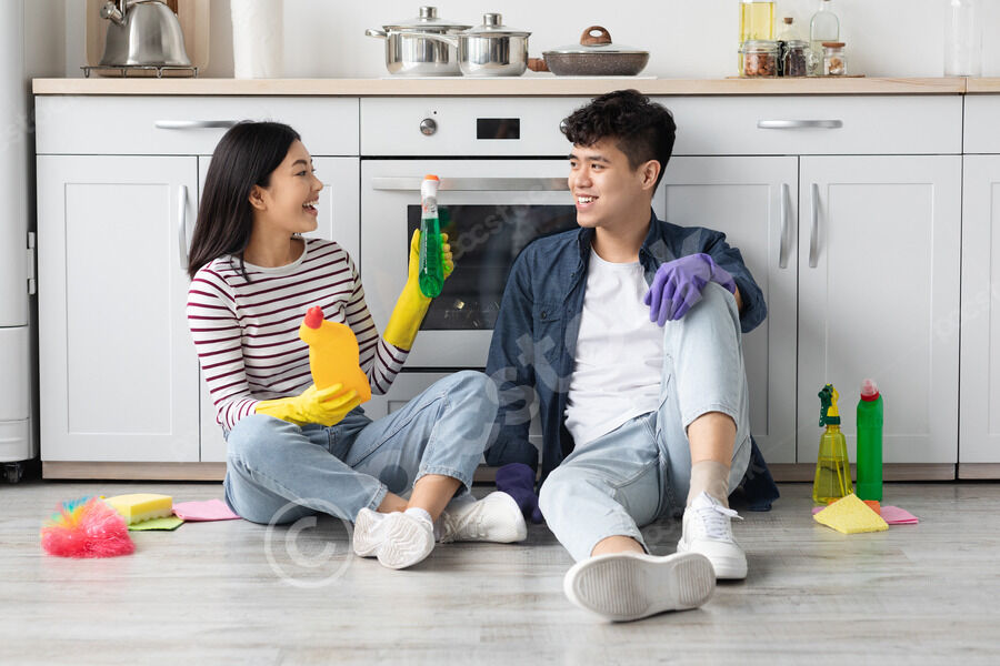 Depressed Asian woman with face leaning on hands looking down sitting on sofa in living room at home