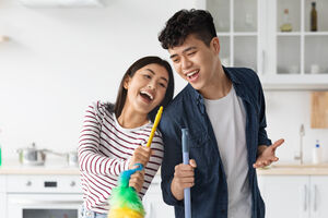 Asian couple wearing rubber gloves singing while using broom and mop as microphones dancing in kitchen at home