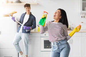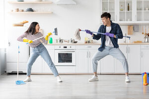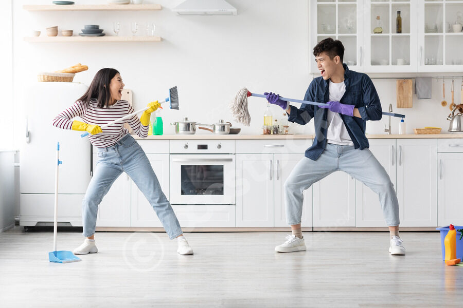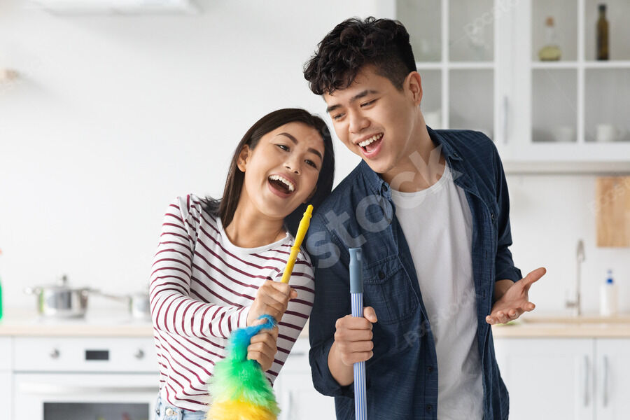 Asian wife wearing rubber gloves singing while using cleaning spray bottle as microphone holding sponge standing near husband using floor brush as guitar in kitchen at home