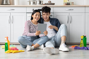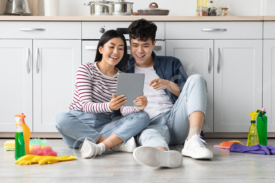 Asian wife holding tablet sitting close together with her husband on floor near cleaning tools in kitchen at home