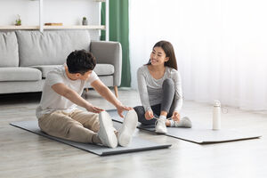 Asian husband doing stretching talking to his wife tying shoelace while sitting on yoga mat in living room at home