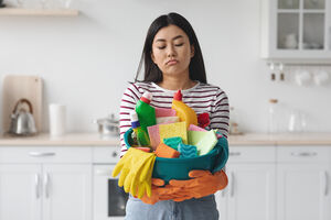 Asian woman wearing rubber gloves holding bucket with cleaning tools while standing in kitchen at home