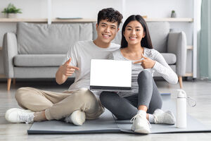 Asian couple showing and pointing at laptop with blank screen while sitting on yoga mats in living room at home