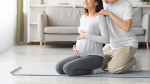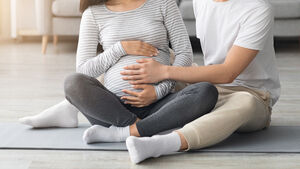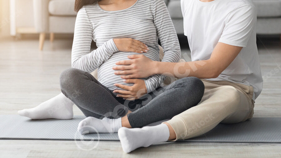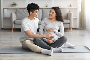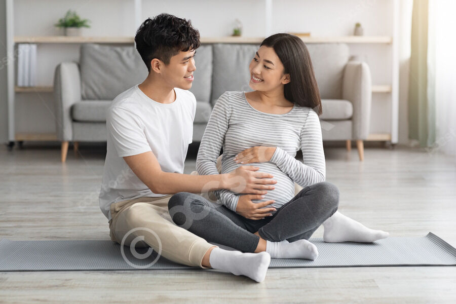 Asian husband touching belly of pregnant wife while sitting together on yoga mat in living room at home